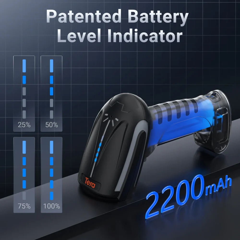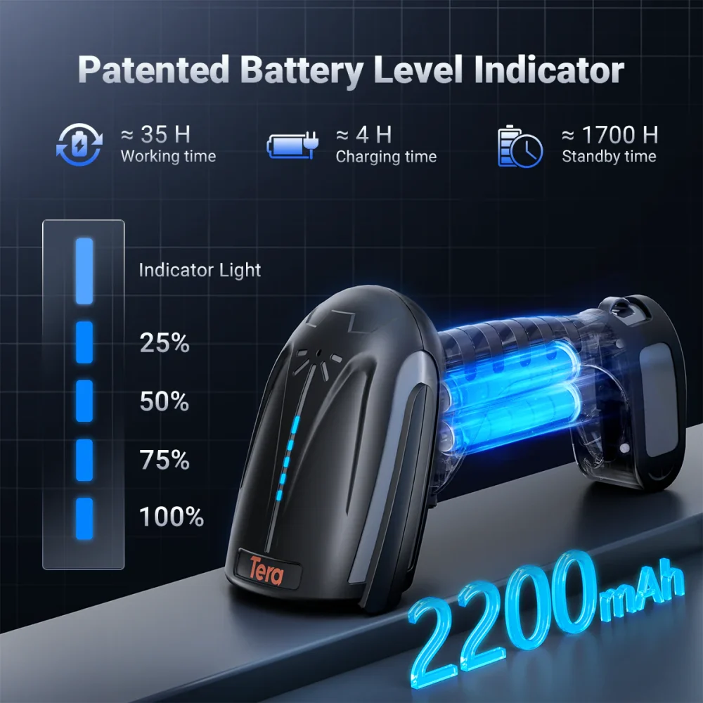 Hãy tưởng tượng nhân viên của bạn đang kiểm hàng trong một kho bãi rộng lớn và máy quét đột ngột hết pin. Thật thảm họa! Tera 8100DPM Pro được trang bị viên pin “khủng” 2200mAh, dư sức đáp ứng những ca làm việc kéo dài liên tục. Tuyệt vời hơn, Tera đã bổ sung dải đèn LED báo pin trực quan (mỗi đèn tương ứng 25% pin) ngay trên thân máy. > Lợi ích cho bạn: Bạn luôn kiểm soát được dung lượng pin, chủ động cắm sạc khi cần. Không bao giờ bị gián đoạn công việc, tối đa hóa năng suất lao động.
